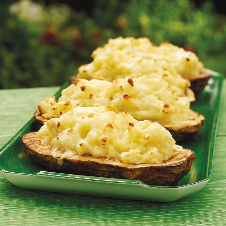 05 Plnené zemiaky grilujte pri nepriamom strednom ohni so zatvoreným vekom, až kým sa syr neroztopí a zemiaky sa neprehrievajú 10 až 15 minút. Podávajte ihneď.